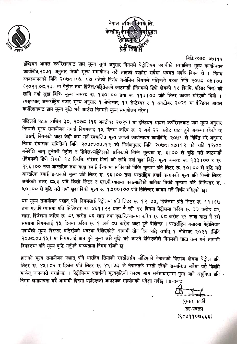 निगमले १ सेप्टेम्बर, १६ सेप्टेम्बर र १ अक्टोबर २०२१ मा ईण्डियन आयल कर्पोरेसनबाट प्राप्त मूल्य वृद्धि भई आउँदा निगमले मूल्य समायोजन गरेको थिएन ।पछिल्लो पटक इन्डियन आयल कर्पेरेसनबाट प्राप्त मूल्यअनुसार निगमले मूल्य समायोजन नगर्दा निगमलाई १५ दिनमा करिव रू. २ अर्ब २२ करोड घाटा हुने अवस्था रहेको निगमले जानकारी दिएको छ ।