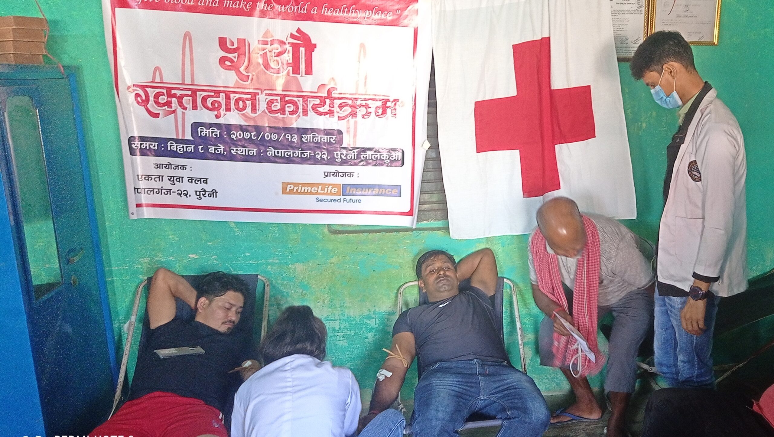 नेपालगन्ज उपमहानगरपालिका वडा नम्बर २२ पुरैनिमा रहेको एकता युवा क्लब र प्राइम लाइफ इन्स्योरेन्सको सहकार्यमा भएको उक्त रक्तदान कार्यक्रममा ४० जनाले रक्तदान गरेका छन ।