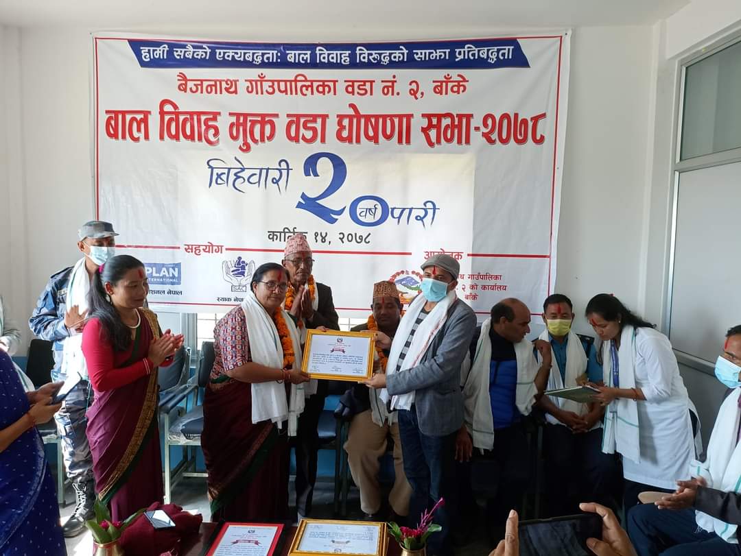 बैजनाथ । बैजनाथ गाउँपालिका वडा न २ लाई बाल विवाह मुक्त घोषणा गरिएको छ । बैजनाथ गाउँपालिका अध्यक्ष मान बहादुर रुचालले वडा लाई बाल विवाह मुक्त घोषणा गरेको हुन ।
