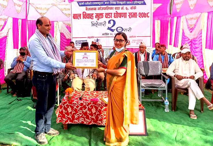 बैजनाथ  / बैजनाथ गाउँपालिकाको वडा न ६ लाई आज बाल विवाह मुक्त वडा घोषणा गरिएको छ । बैजनाथ गाउँपालिकाका अध्यक्ष मान बहादुर रुचाल र उपाध्यक्ष शारदा रेग्मी विकले वडालाई बाल विवाह मुक्त घोषणाको प्रमाणत्र वडा अध्यक्ष भद्र बहादुर बस्नेतलाई हस्तान्तरण गरेका थिए ।