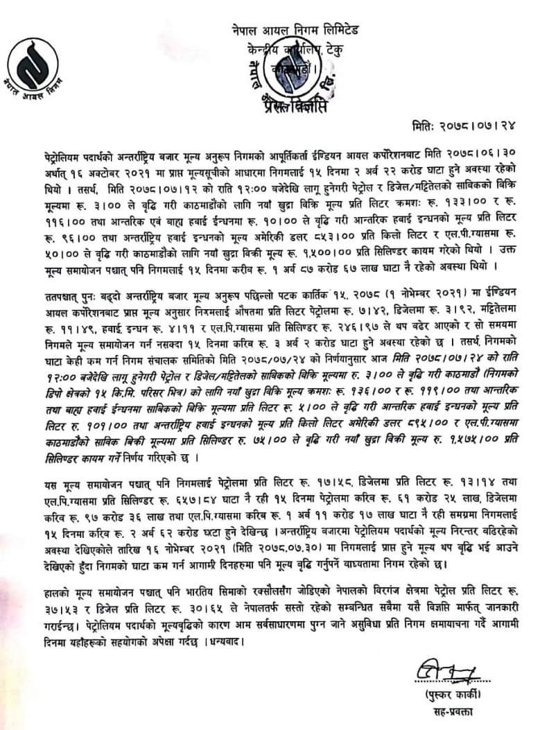 यसअघि निगमले गएकाे कात्तिक १२ गते इन्धनकाे मूल्य बढाएकाे थियाे ।