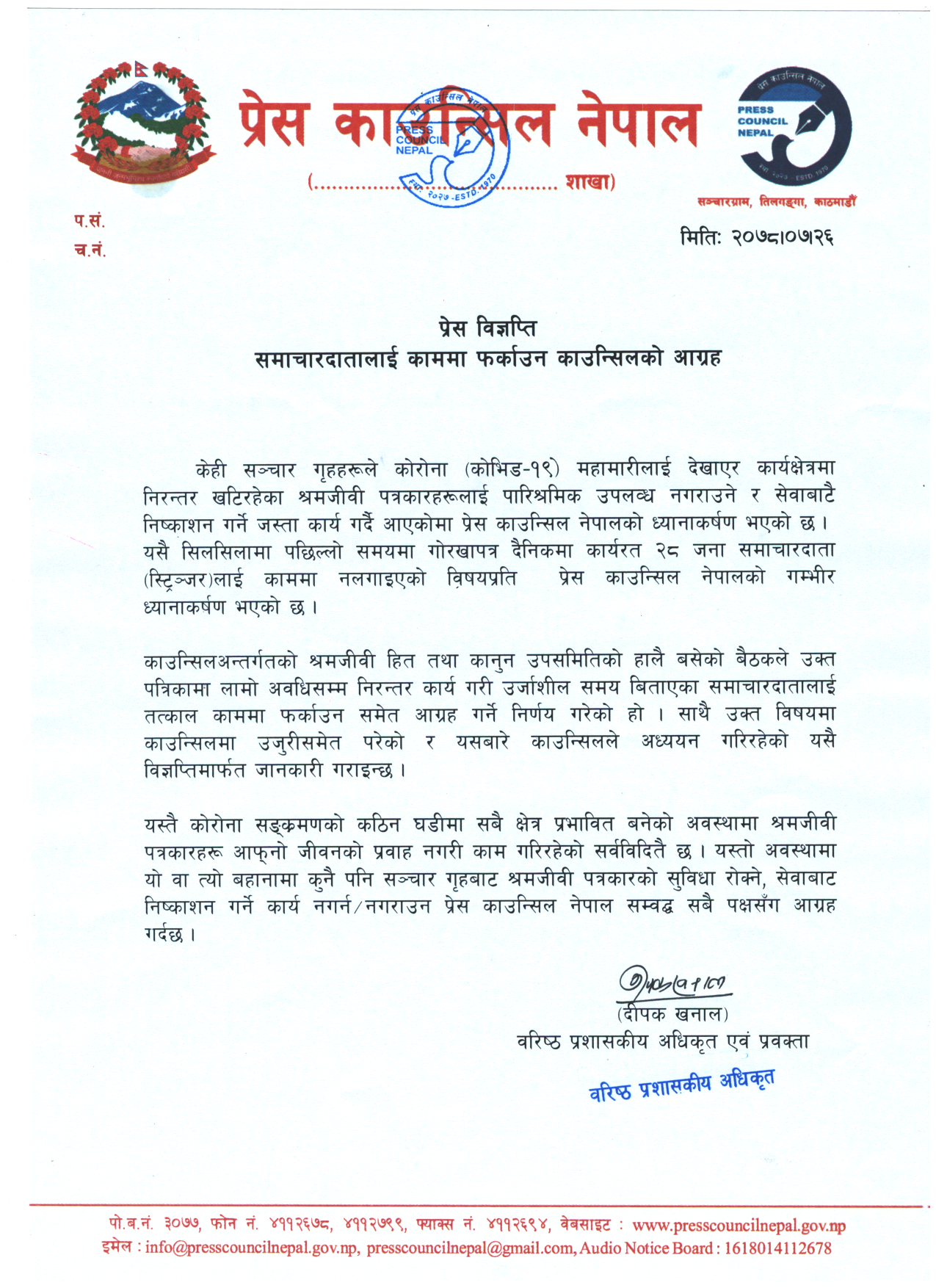 समाचारदातालाई काममा नलगाइएको विषयप्रति प्रेस काउन्सिल नेपालकाे ध्यानाकर्षण