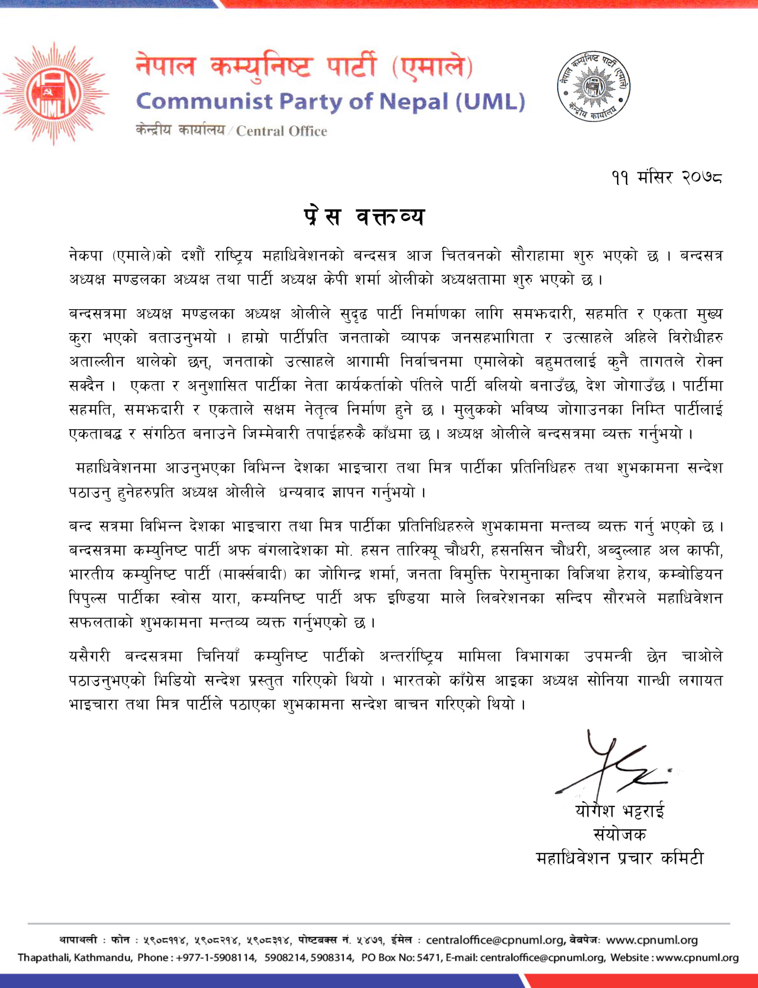 महाधिवेशनमा आउनुभएका विभिन्न देशका भाइचारा तथा मित्र पार्टीका प्रतिनिधिहरु तथा शुभकामना सन्देश पठाउनु हुनेहरुप्रति अध्यक्ष ओलीले धन्यवाद ज्ञापन गर्नुभयो । बन्द सत्रमा विभिन्न देशका भाइचारा तथा मित्र पार्टीका प्रतिनिधिहरुले शुभकामना मन्तब्य ब्यक्त गर्नु भएको छ । बन्दसत्रमा कम्युनिष्ट पार्टी अफ बंगलादेशका मो. हसन तारिक्यू चौधरी, हसनसिन चौधरी, अब्दुल्लाह अल काफी, भारतीय कम्युनिष्ट पार्टी ( माक्र्सबादी) का जोगिन्द्र शर्मा, जनता विमुक्ति पेरामुनाका विजिथा हेराथ, कम्बोडियन पिपुल्स पार्टीका स्वोस यारा, कम्यनिष्ट पार्टी अफ इण्डिया माले लिबरेशनका सन्दिप सौरभले महाधिवेशन सफलताको शुभकामना मन्तव्य व्यक्त गर्नुभएको छ ।