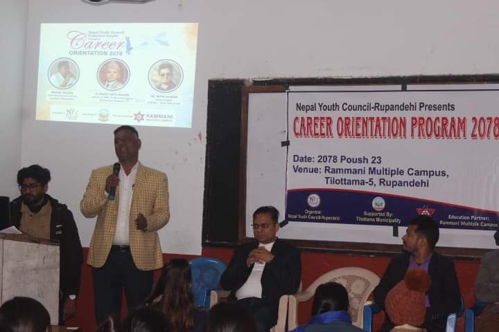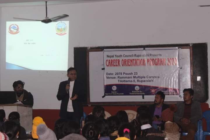 बुटवल। नेपाल युवा परिषद रुपन्देही शाखाको आयोजना तथा तिलोत्तमा नगरपालिकाको सहयोगमा तिलोत्तमा ५ स्थित राममणि बहुमुखी क्याम्पसमा अध्ययनरत विद्यार्थीलाई जीवनबृति अभिमुखिकरण (क्यारियर ओरिएन्टेसन) गरिएको छ।