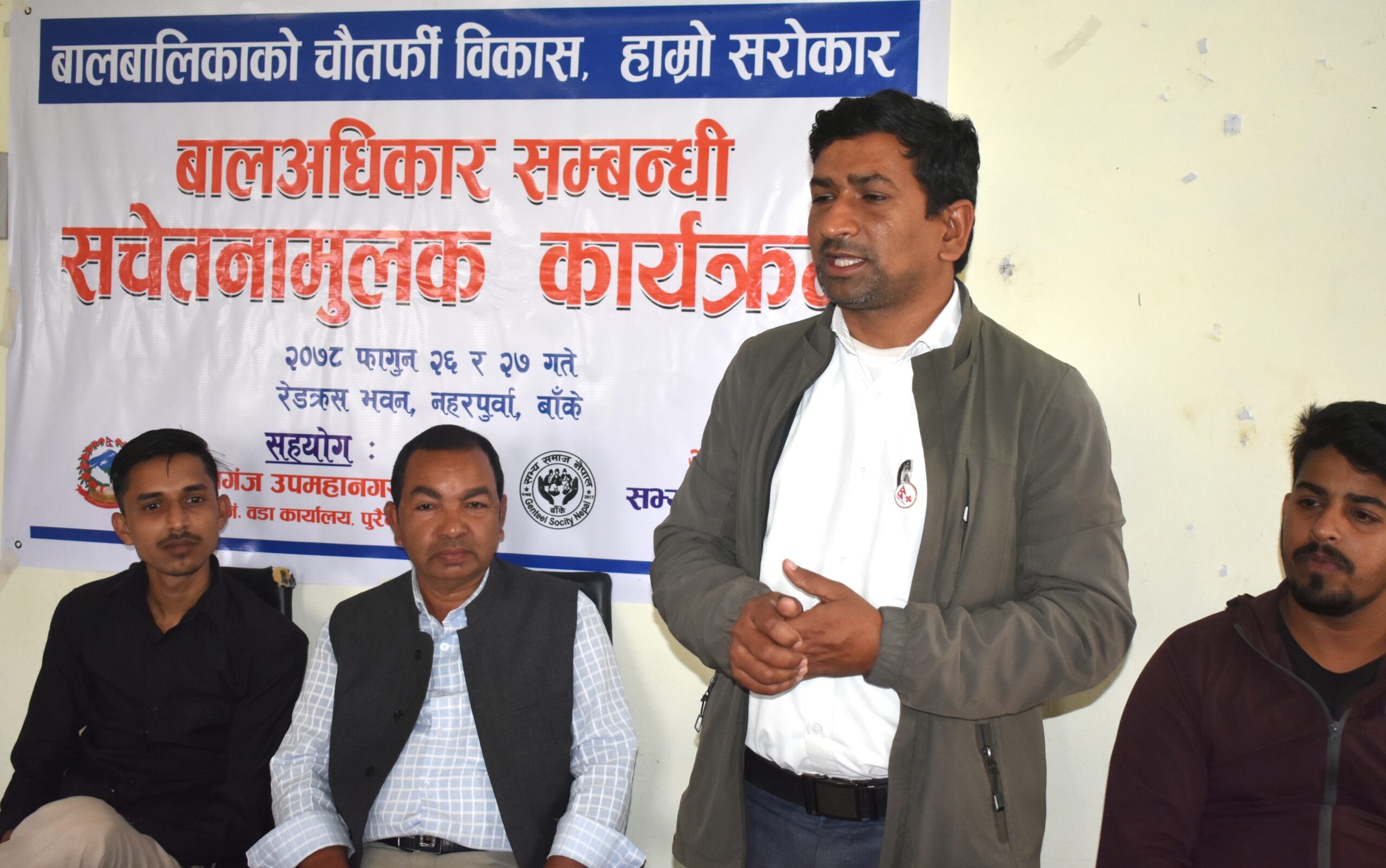 नेपालगन्ज / बाल विवाहको विरुद्धमा आवाज उठाउने पुरैनीका किशोर र किशोरीले प्रतिबद्धता जनाएका छन् । नेपालगन्ज उपमहानगरपालिका वडा नं.२२ को आर्थिक सहयोगमा सभ्य समाज नेपालको आयोजनामा २ दिने बाल अधिकार सम्बन्धि सचेचनामुलक ताालिममा सो कुरा बताएका हुन् । सो तालिममा नेपालगंज उपमहानगरपालिका वडा नंं २२ को बालबालिकाहरुको सहभागिता रहेको थियो ।