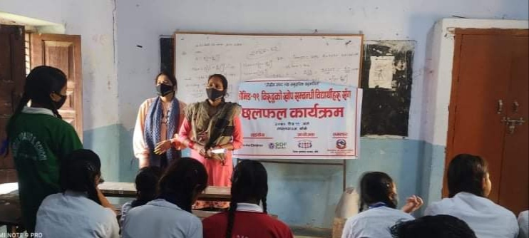 नेपालगन्ज । कोमिड–१९ बिरुद्धको खोप सम्बन्धी बिद्यार्थीहरु संग छलफल कार्यक्रम नेपालगंजको मंगल प्रसाद मा.वि र नारायण मा. वि का कक्षा ११ र १२ मा अध्यनरत ६० जना बिद्यार्थीहरु संग छलफल कार्यक्रम सम्पन्न भएको छ । विद्यालय स्तरमा कोमिड–१९ बिरुद्धको सचेतना फैलाउन र कोरोना बिरुद्धको खोपको पहुँचमा पुन्याउनका लागि बिद्यार्थीहरु बीच छलफल गरिएको हो ।