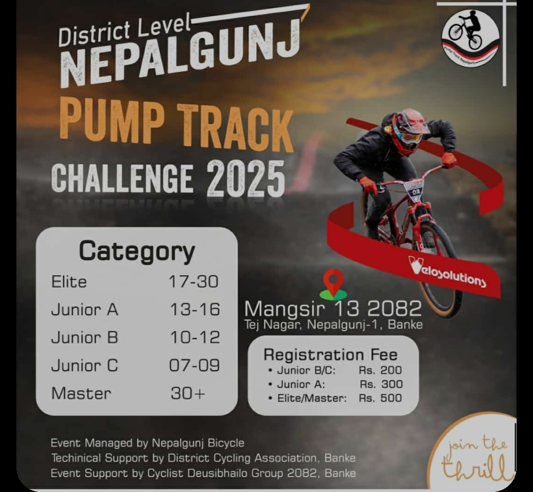 बाँके । जिल्ला साइकलिस्ट क्लब बाँकेले आयोजना गर्ने जिल्ला स्तरीय नेपालगञ्ज पम्प ट्र्याक च्यालेन्ज –२०२५ यही मंसिर १३ गते नेपालगञ्ज–१ को तेजनगरस्थित नेपालगञ्ज पम्प ट्र्याकमा हुने भएको छ। प्रतियोगिता बिहान ११:३० बजेबाट सुरु हुने आयोजकले बताएका छन्।