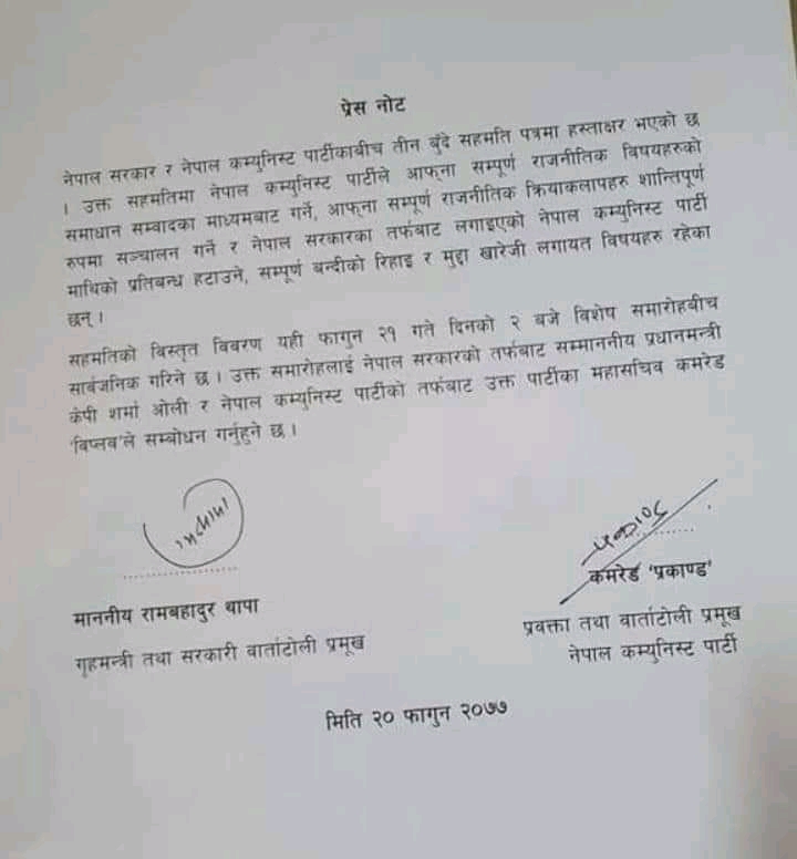 त्यस्तै सरकारले नेपाल कम्युनिष्ट पार्टी माथि लगाएको प्रतिबन्ध हटाउने, सम्पूर्ण बन्दीहरुको रिहा र मुद्दा खारेजी लगायतका विषय सहमतिमा समेटिएको जनाइएको छ । सरकार र विप्लव समूहबीच आज (बिहीबार) तीन बुँदे सहमति भएपछि विप्लव यहि २१ गते (भोली) सार्वजनिक हुँदै छन् ।