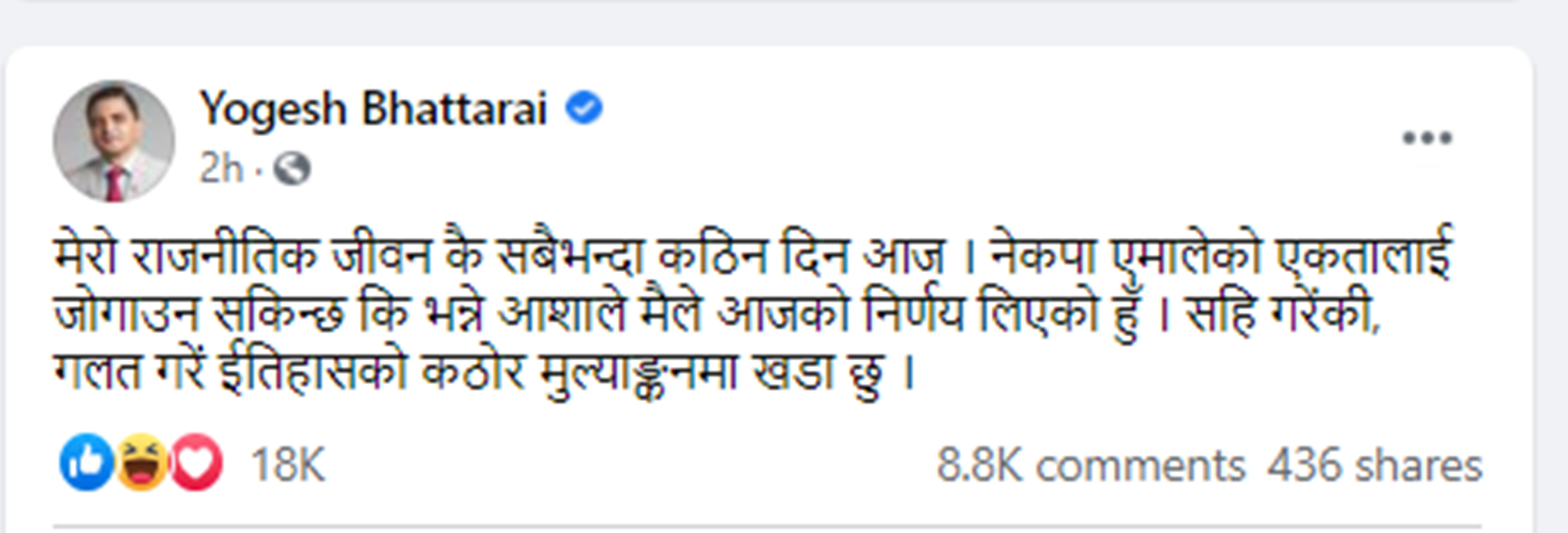 ‘मेरो राजनीतिक जीवन कै सबैभन्दा कठिन दिन आज । नेकपा एमालेको एकतालाई जोगाउन सकिन्छ कि भन्ने आशाले मैले आजको निर्णय लिएको हुँ । सही गरेकी, गलत गरेँ इतिहासको कठोर मूल्याङ्कनमा खडा छु। योगेशले आज लेखेका छन् ।
