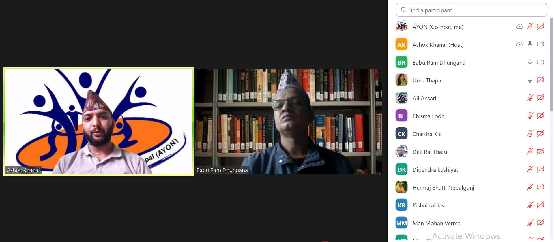 नेपालगंज / नेपाल युवा संस्था संजाल आयोन काठमाण्डौं को आयोजनमा IFES को सहयोगमा संचालित सुशासनका लागि युवा परियोजना अन्र्तगत स्थानिय तहको योजना प्रक्रियामा युवा सहभागिता सम्बन्धी नमुना कार्यबिधि कार्यान्वय बिषयक अन्तरक्रिया कार्यक्रम भर्चुअल रुपमा सम्पन्न भएको छ ।