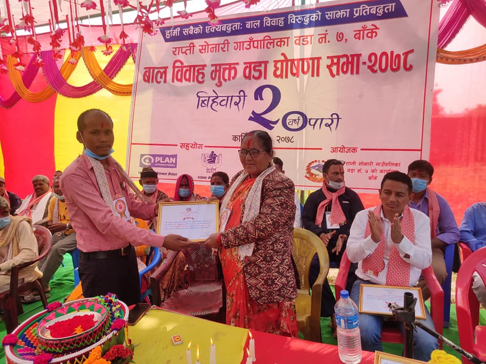 राप्तीसोनारी / बाँकेको राप्ती सोनारी गाउँपालिका वडा नम्बर ७ लाई बिहिबार एक कार्यक्रमका वीच बालविवाह मुक्त वडा..